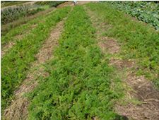 | すっかり農作業も板についた、今年の研修生大畑くん。旱魃で発芽が揃わなかった赤かぶ。 |